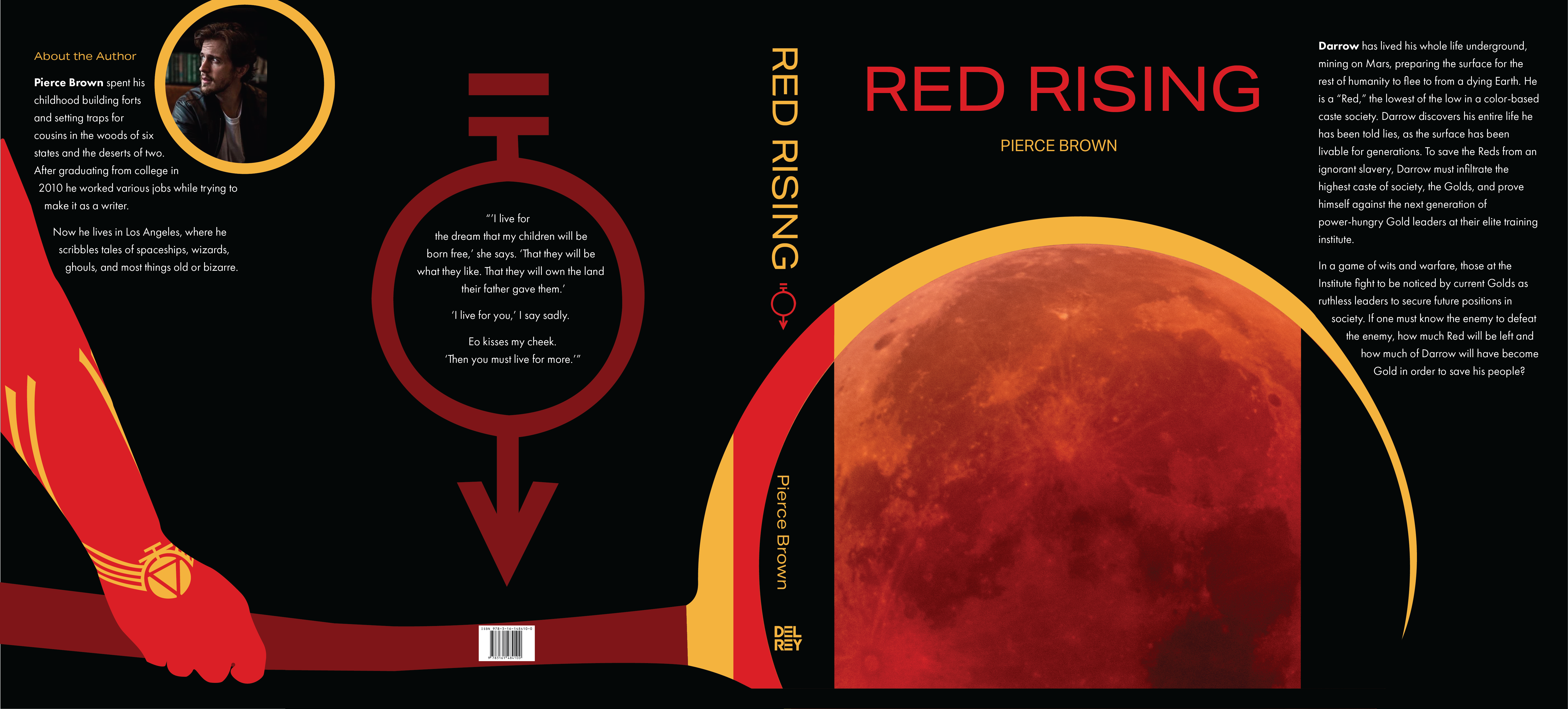 My take on the book design for Pierce Brown’s dystopian sci-fi novel Red Rising. Jacket design intentionally plays with the uncovering of sections to make a complete image which both physically and metaphorically becomes clear to the reader once the book is finished.